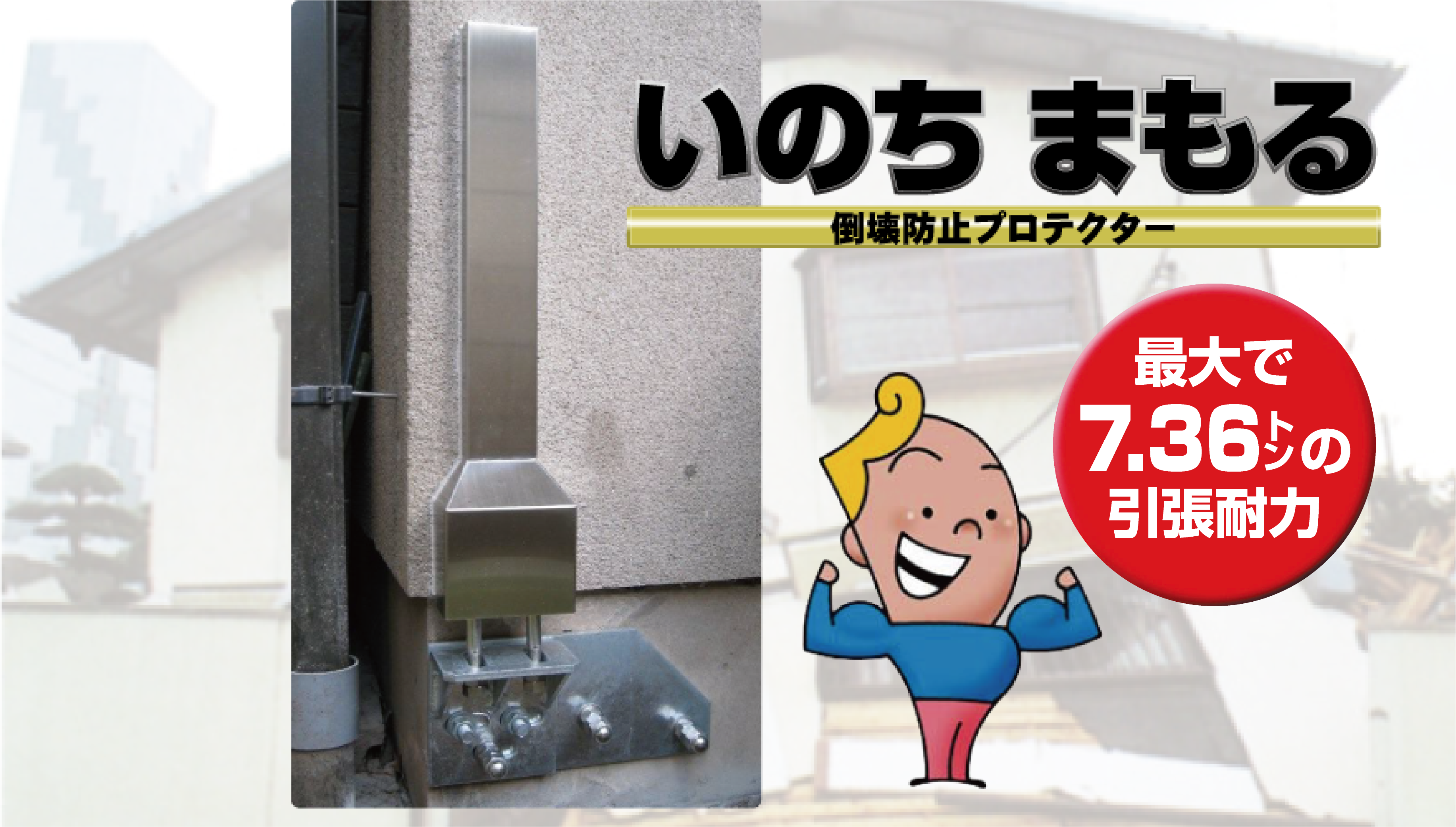 【いのちまもる】は、既存の住宅に外側から設置する後付けホールダウン金物です。土台と基礎と柱を緊結することで、巨大地震時の主な倒壊原因のひとつである「ホゾ抜け」を防止することで家屋が倒壊することを防ぎます。