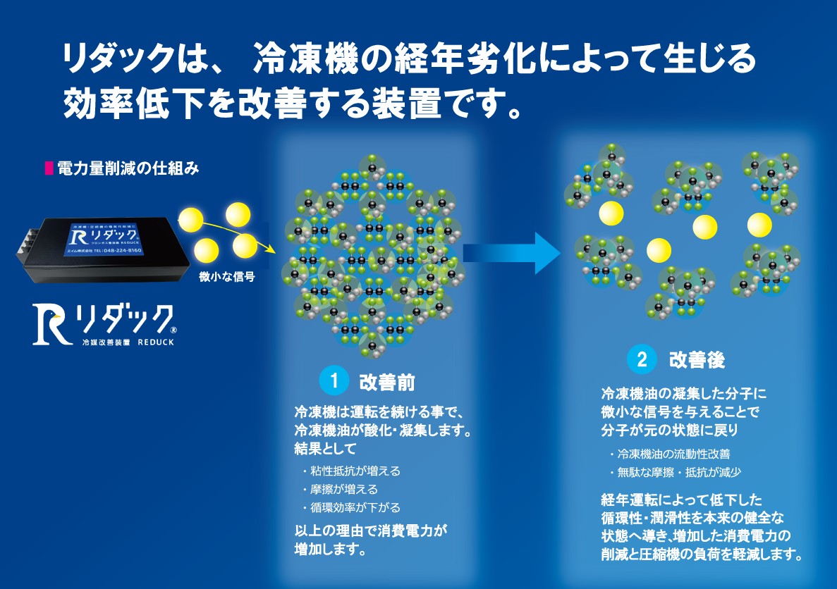 冷蔵・冷凍・空調機等で使用される冷媒は、電気陰性度の異なる原子で構成され、分子レベルで電気的な極性を持っています。これによって圧縮や膨張を繰り返した分子は、お互いに引き付け合い巨大化する事で、吸熱放熱の効率が低下することを見出しました。その事実から、インバーター制御やDCモーターでの省エネだけでなく、冷媒そのものの吸熱放熱の効率を改善させるというコロンブスの卵的な発想である本技術の開発は素晴らしいと考えます。